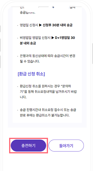 전환 가능금액,예정포인트,예정수수료를 확인한 후 하단의 충전하기 버튼을 눌러 포인트를 전환 할 수 있습니다.